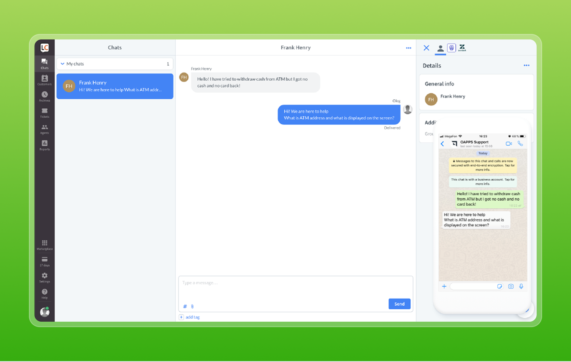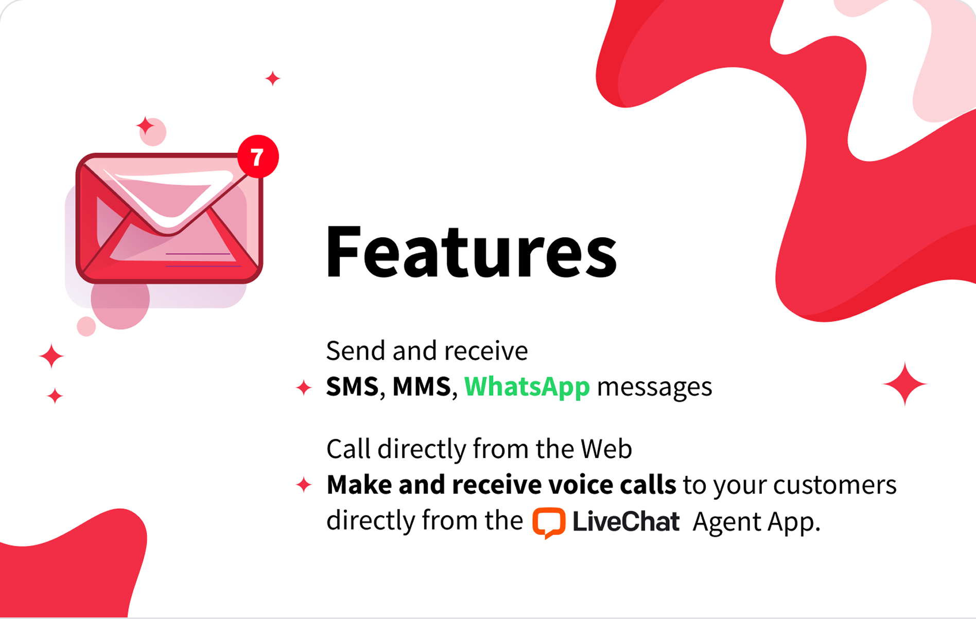 Integrate your business phone numbers with LiveChat to send and receive SMS, voice, and WhatsApp messages, all inside one chat window. Agents can also initiate outbound conversations without waiting for customers to reach out first.