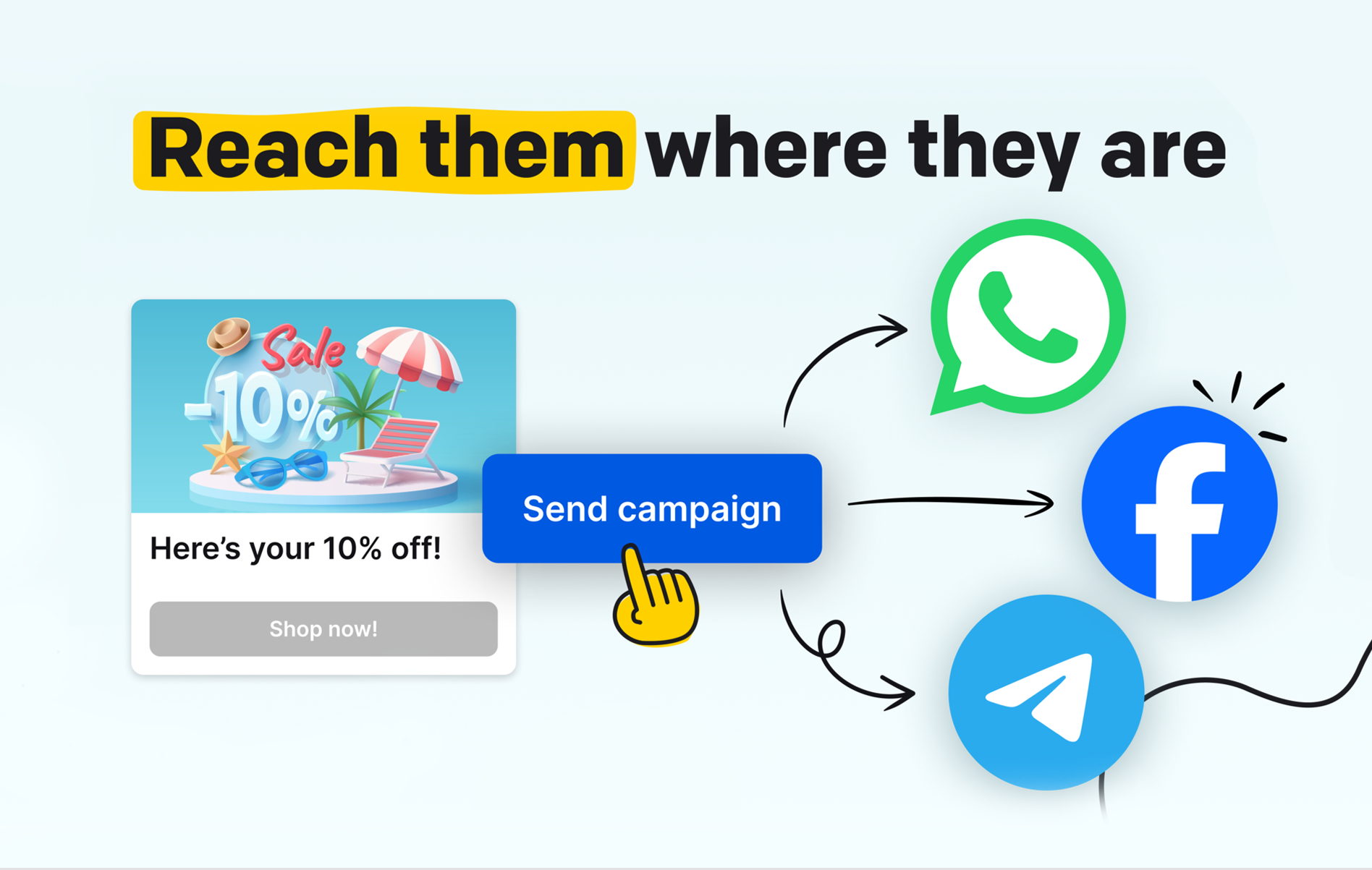 Proactively reach customers across WhatsApp, Messenger, and Telegram from one dashboard. Schedule campaigns, segment audiences, and track performance — all outbound channels managed centrally, with up to 98% open rates.