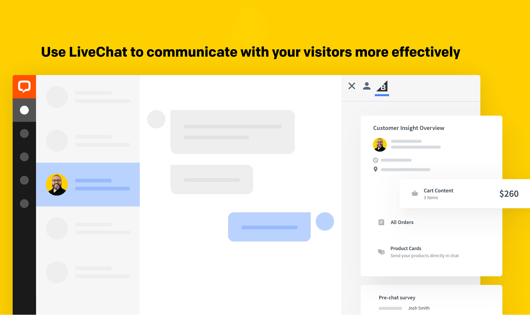 See cart contents, access purchase history, and send product cards with images and pricing, all inside the chat. Agents close more sales with real-time Customer Insight, without ever leaving the LiveChat interface.