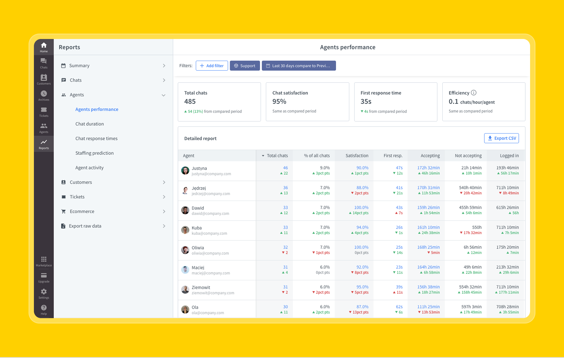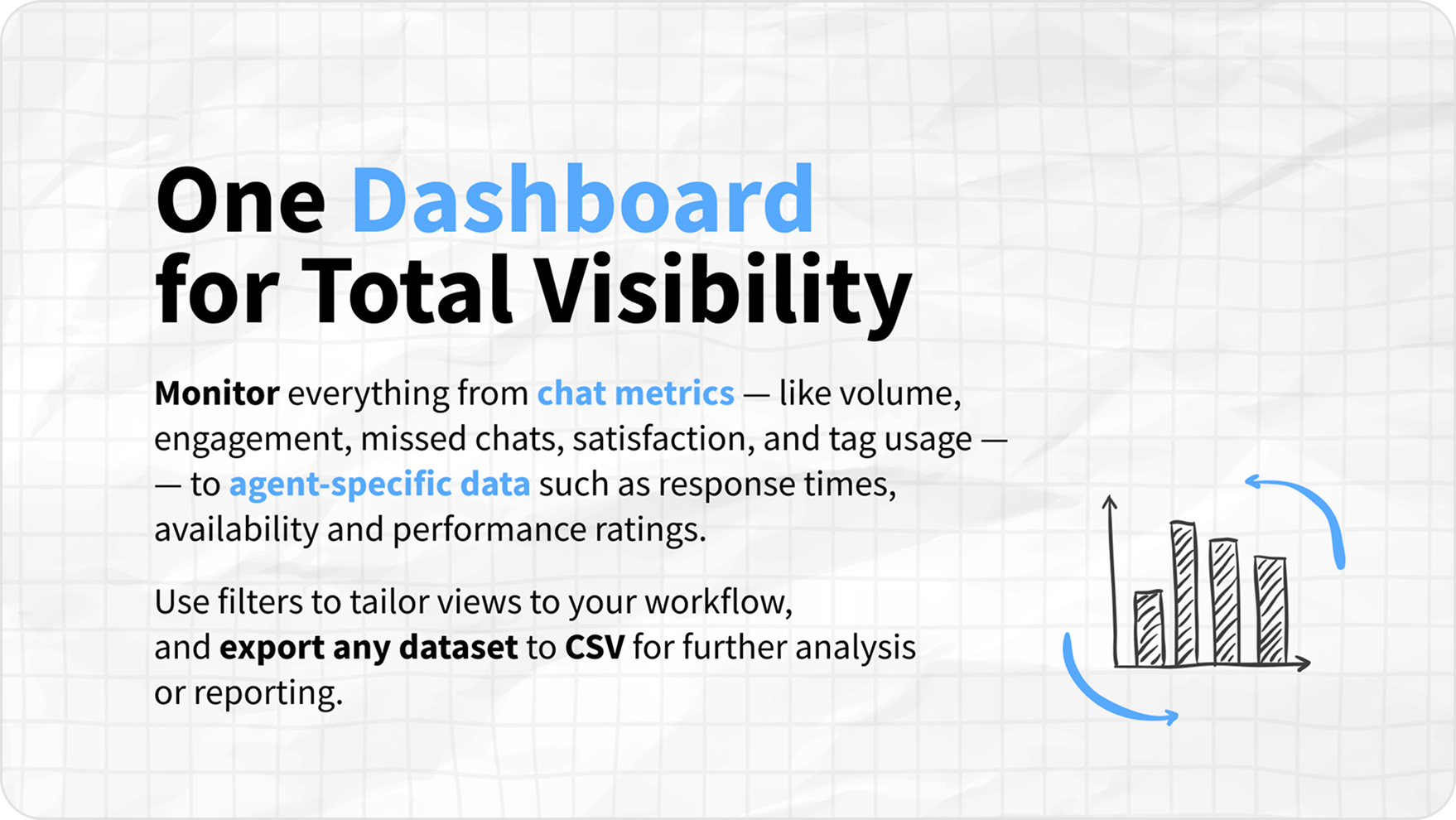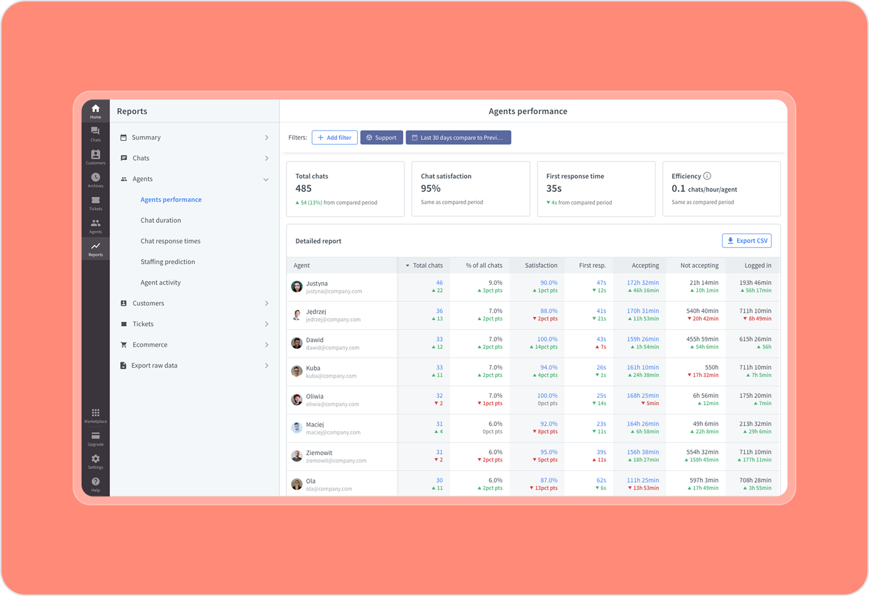 Get every key metric — chats handled, response times, CSAT, and efficiency — in one table. Quickly identify top performers and spot agents who need coaching to improve.