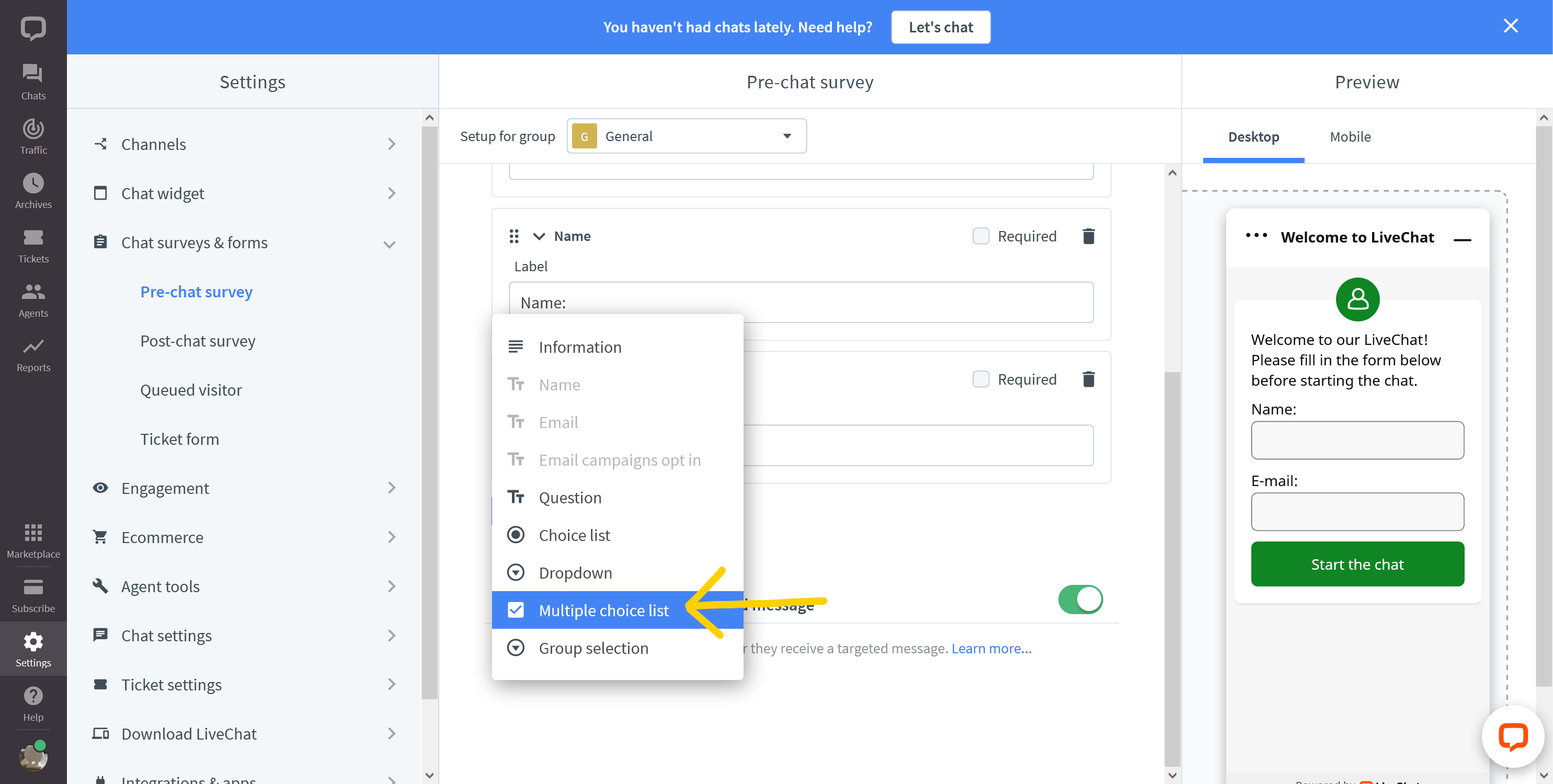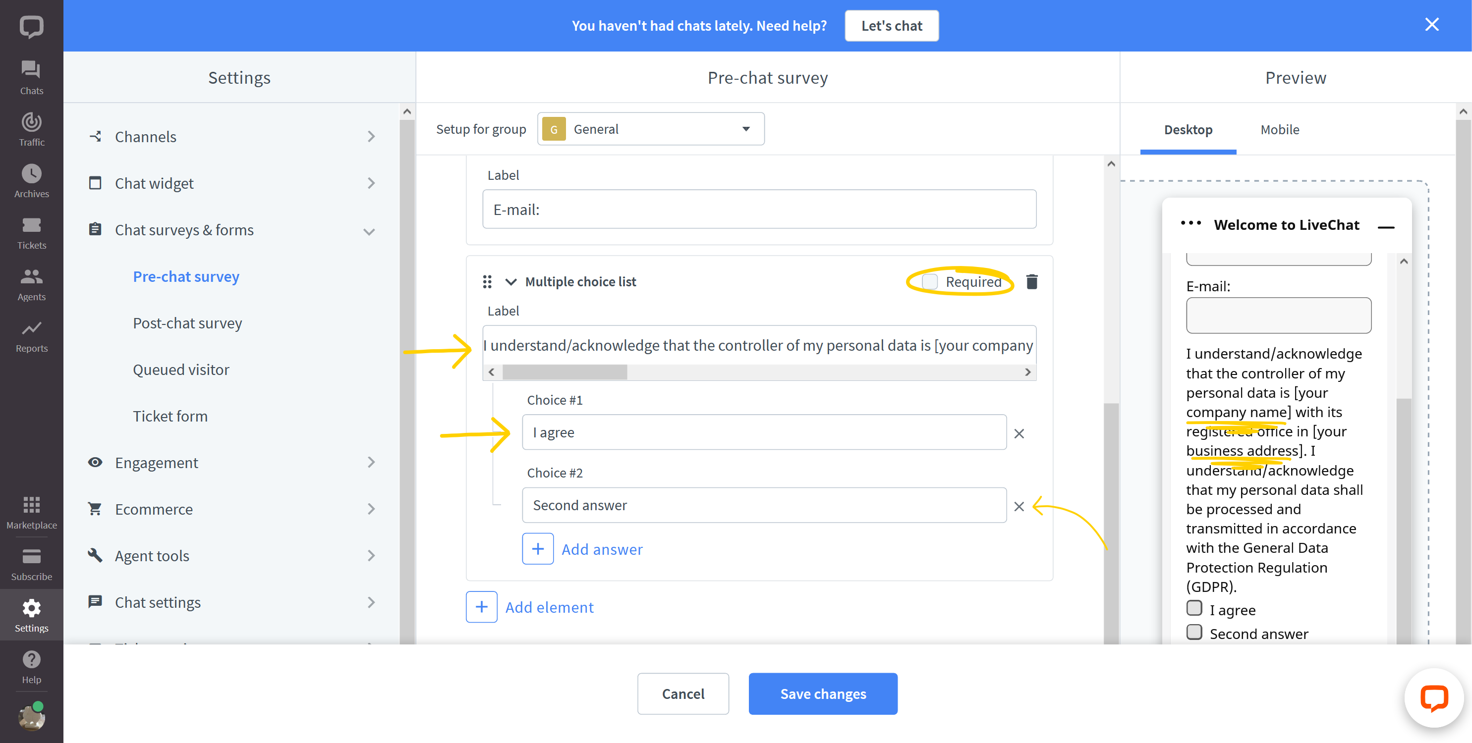 Display the pre-chat form: Don’t forget to mark your Multiple choice list as required! If you don’t, your end-users will be able to start a chat without agreeing to the content you prepared for them.