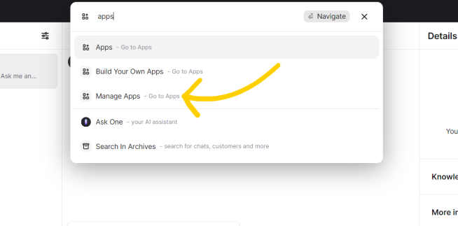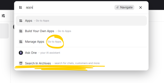 Search bar will list all the available options associated with your query. You’ll see associated app sections and actions next to every option returned by the search.