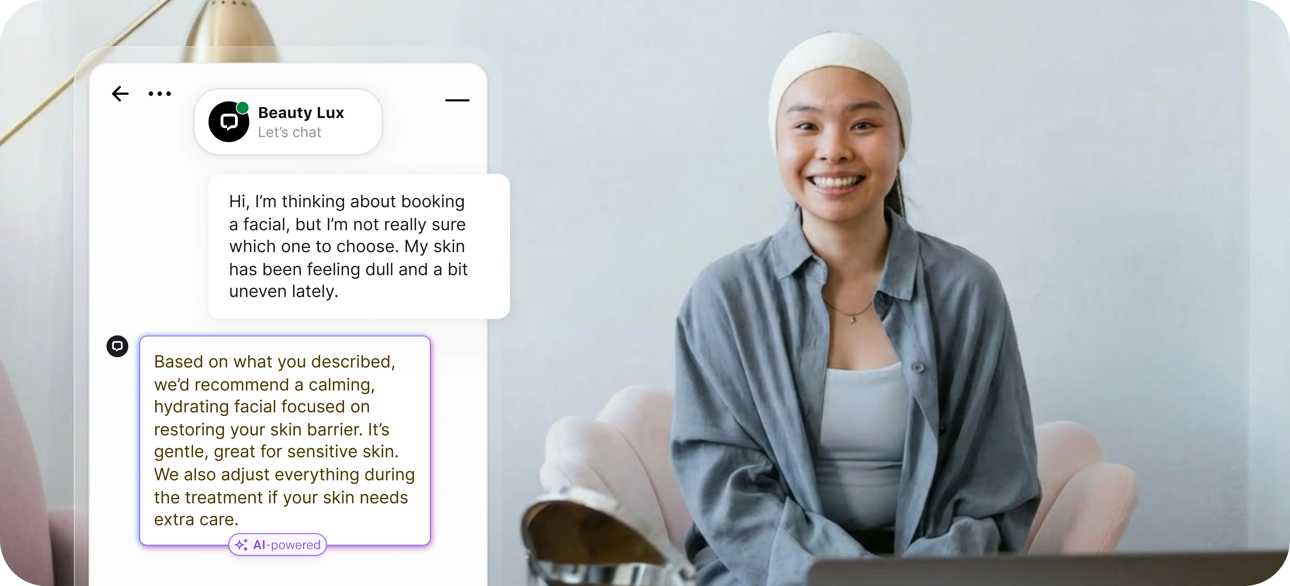 Clients can ask detailed questions about beauty services, get personalized recommendations, and receive beauty tips through chat. Your team sees client preferences and history, enabling them to suggest treatments that match each person's needs - turning casual inquiries into booked appointments.