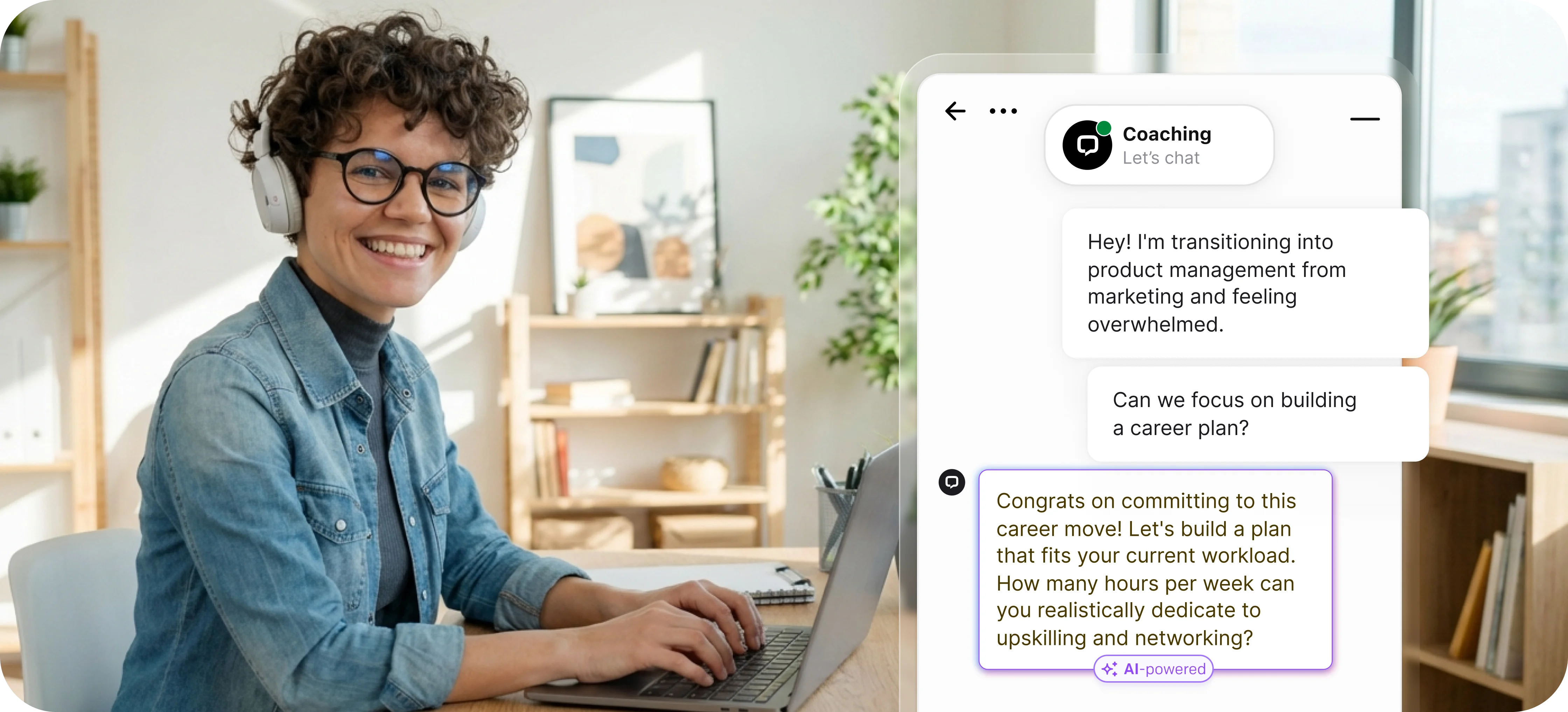 LiveChat combines AI coaches for instant responses with real person support. AI handles routine questions about session schedules and cost, then transfers to human coaches for personalized guidance, leadership development, or complex life coaching conversations.