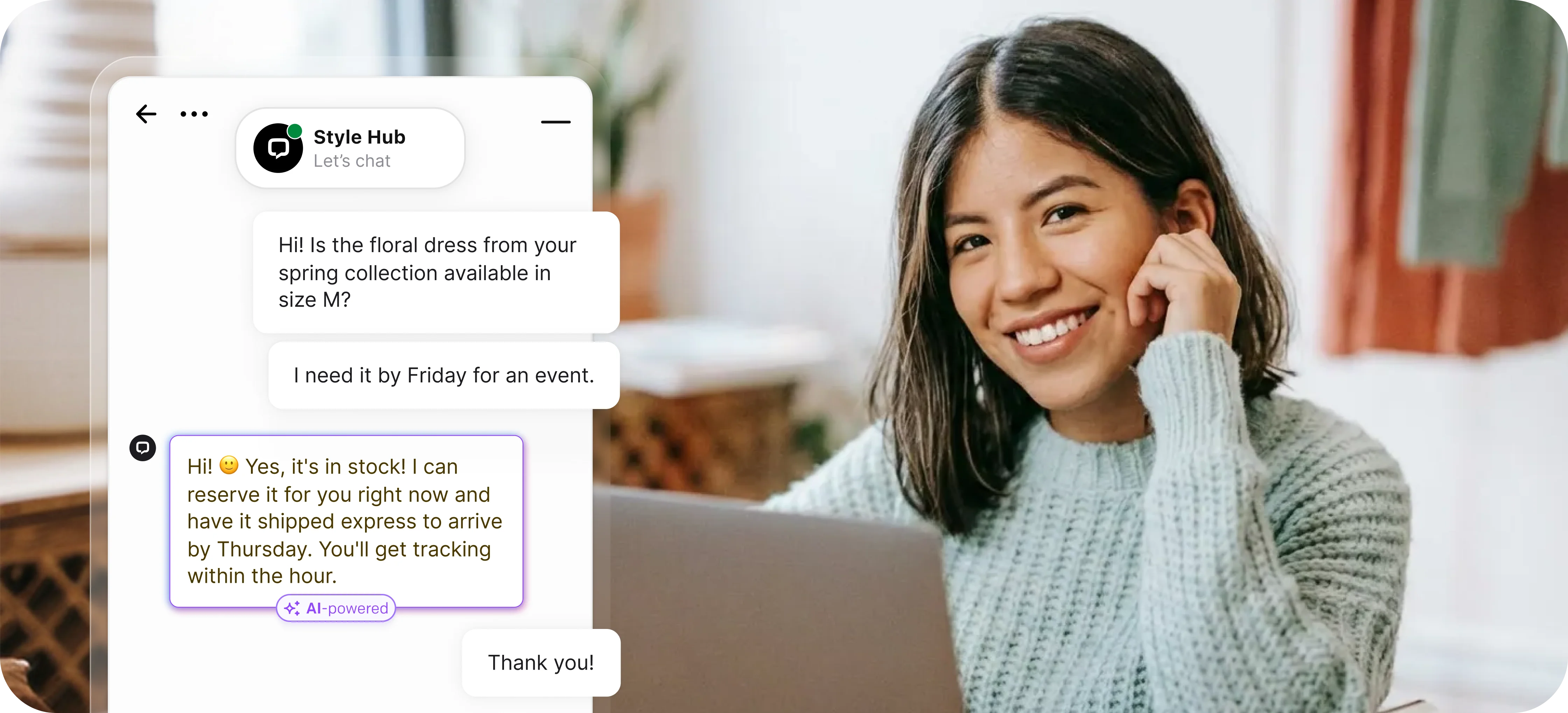 Add AI chatbots to answer common questions about sizing, returns, and shipping instantly. Transfer to human agents when shoppers need personal styling advice - the best of self-service and live chat combined.