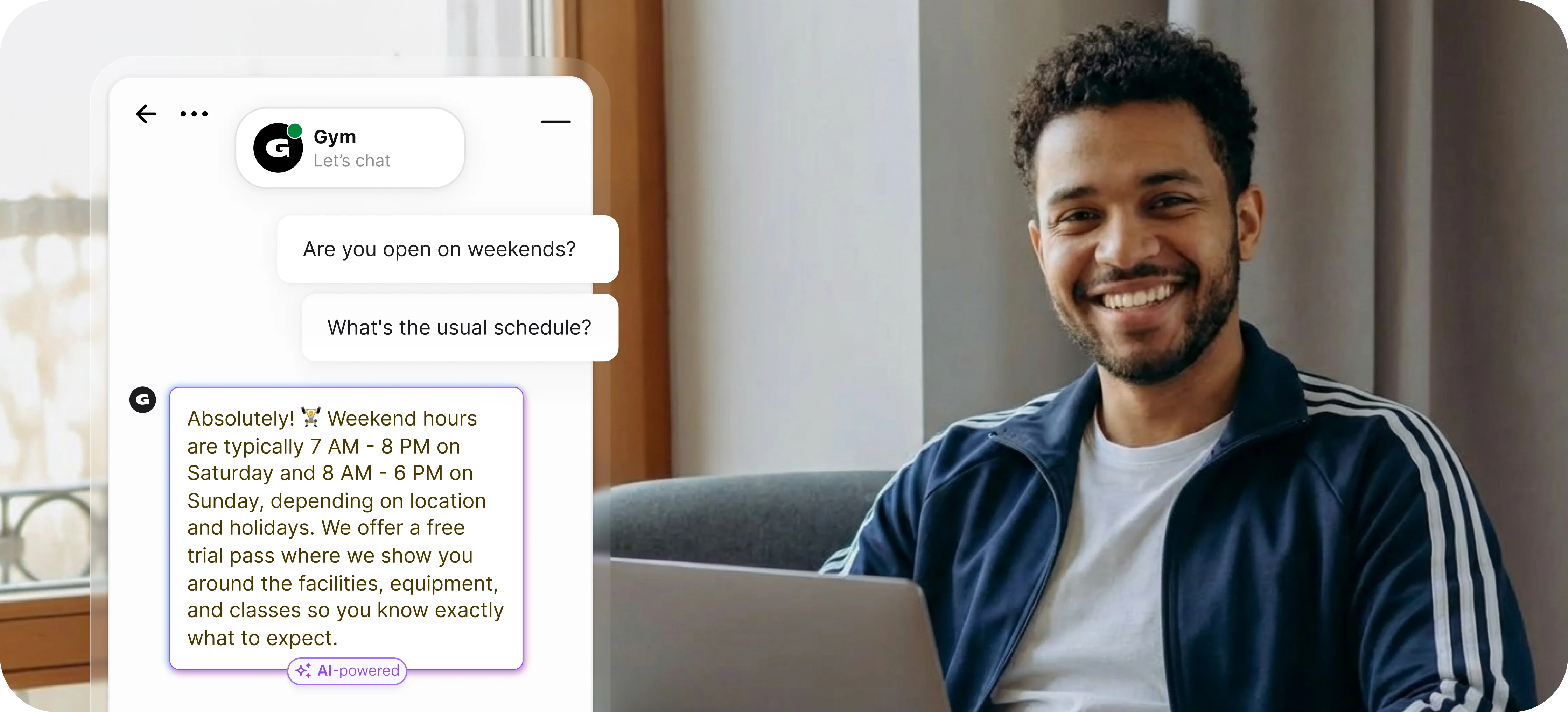 Absolutely. Live chat for class booking allows members to quickly find available sessions, check times, and reserve spots without calling. AI can answer schedule questions 24/7, providing instant information about gym hours, class availability, and trainer schedules.
