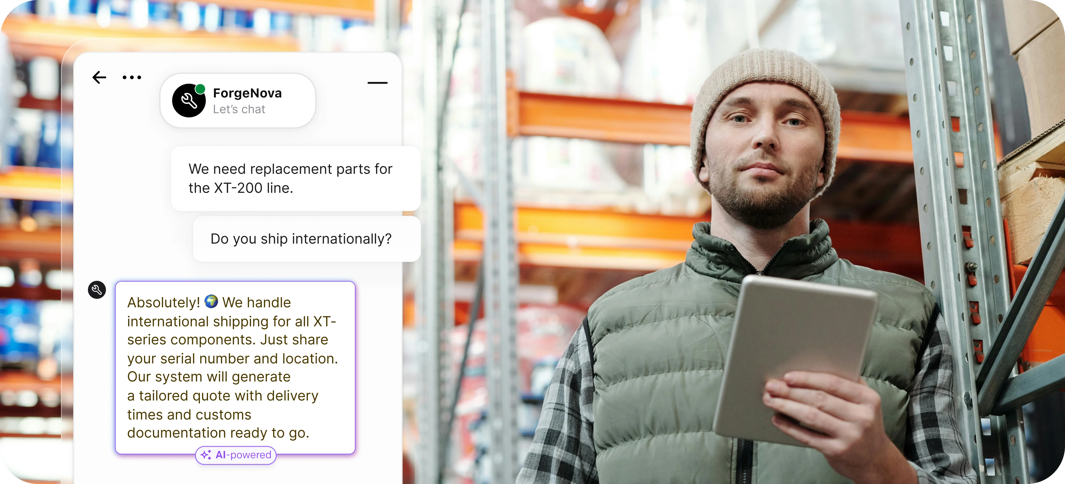 Yes. AI-powered chatbots enable manufacturers to provide around-the-clock support across various time zones without increasing headcount. This 24/7 availability ensures customer inquiries are captured at all times, allowing visitors to get instant answers about your products, specs, or processes even when your chat team isn't available - greatly enhancing lead capture without adding to your employee workload.