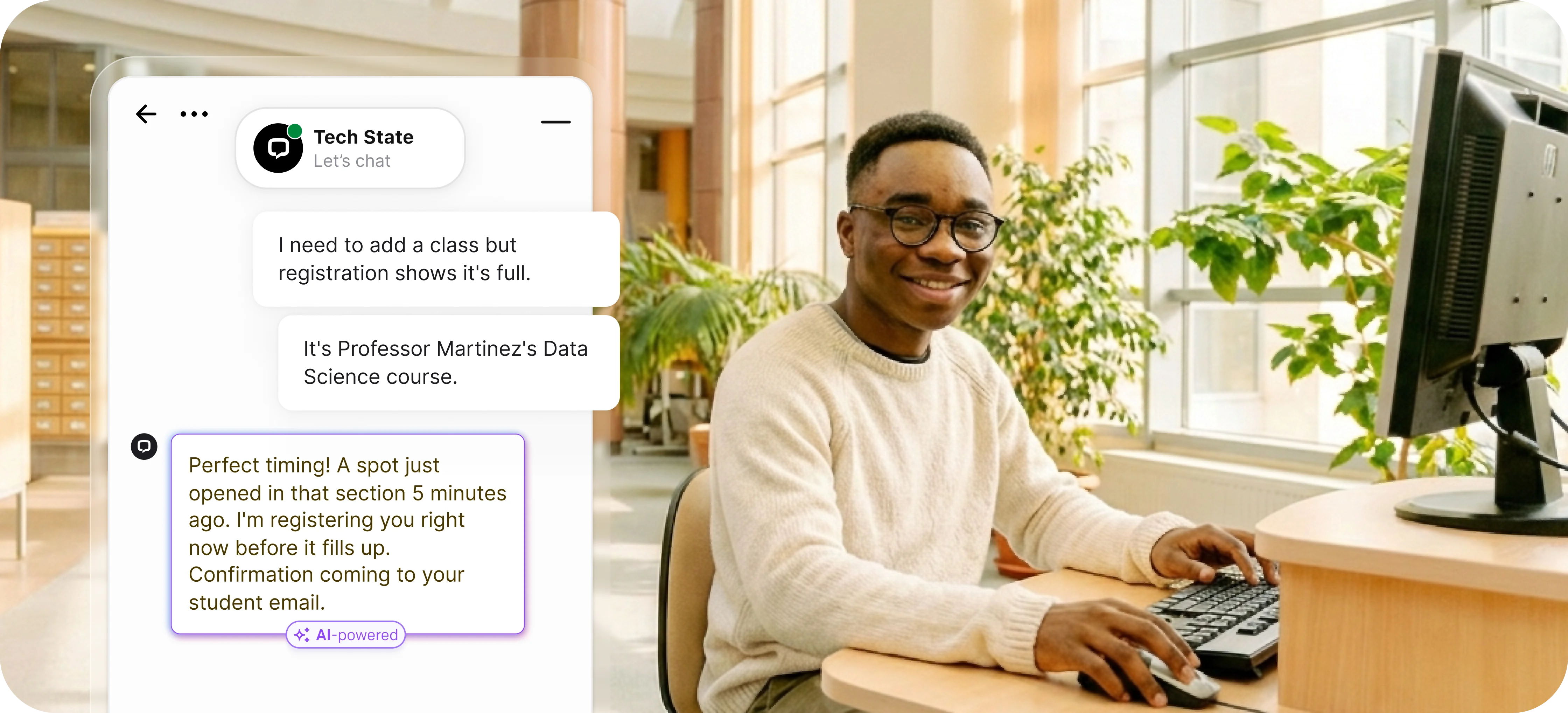 Add AI chatbots to answer student questions instantly, then transfer to staff when needed. This approach lets small university teams deliver enterprise-level satisfaction across campus.